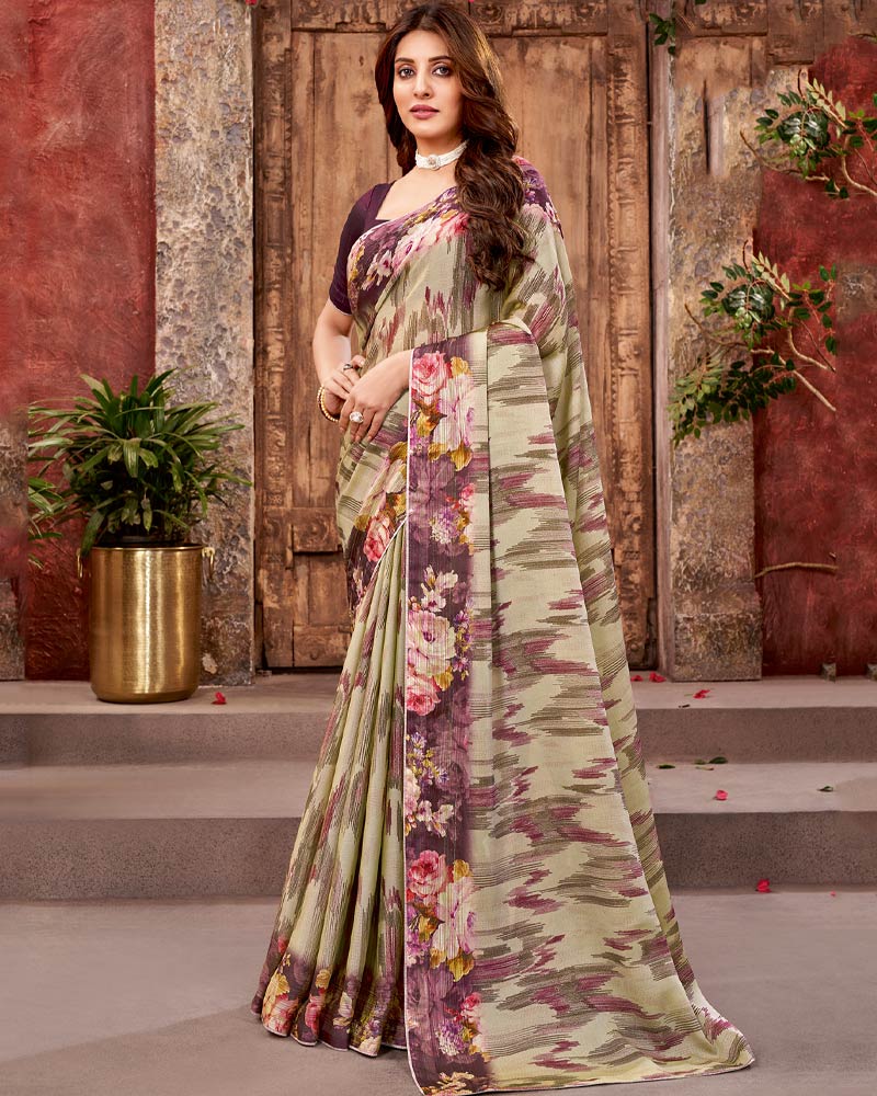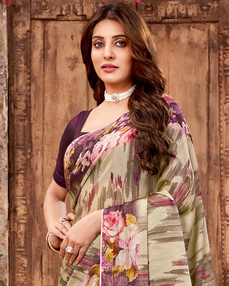 Vishal Prints Pastel Brown Fancy Chiffon Digital Print Saree With Core Piping