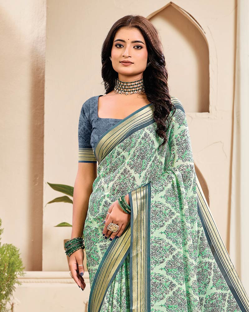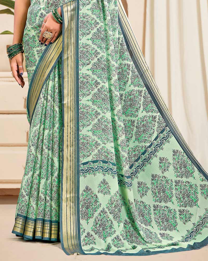 Vishal Prints Pastel Green Digital Print Criva Crepe Saree With Weaved Viscose Patta