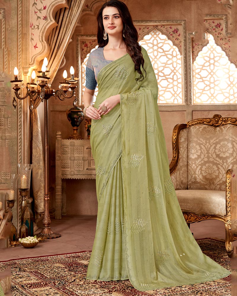 Vishal Prints Pastel Olive Designer Fancy Chiffon Saree With Embroidery Diamond Work And Core Piping