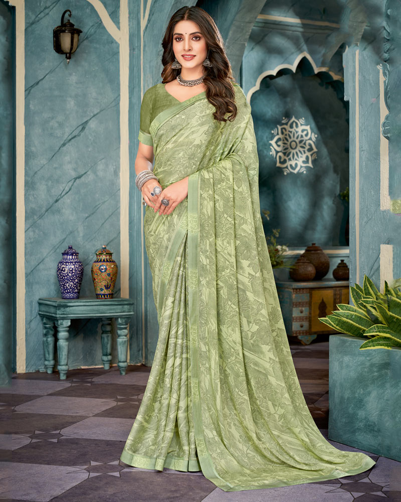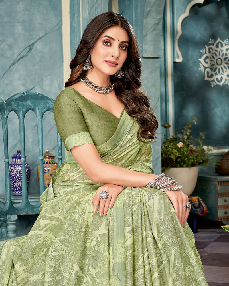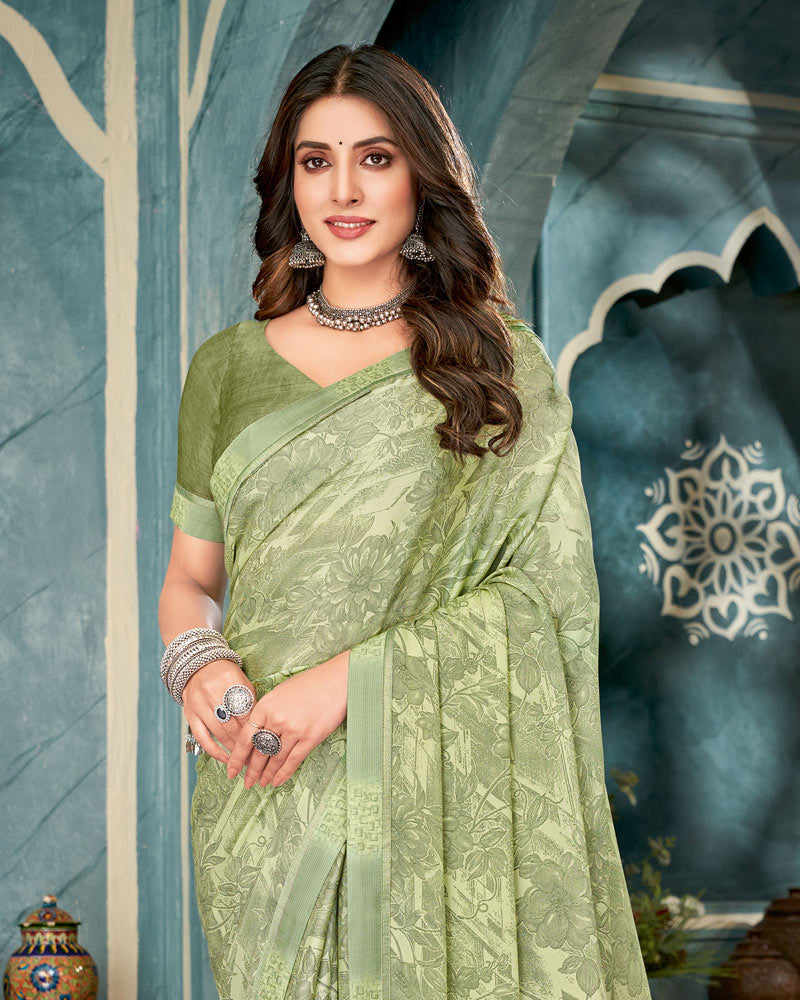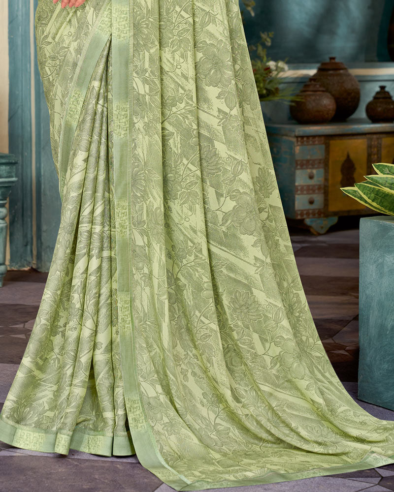 Vishal Prints Pastel Olive Printed Criva Crepe Saree With Fancy Border