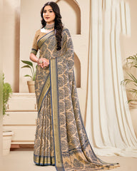 Vishal Prints Pastel Orange And Charcoal Grey Digital Print Criva Crepe Saree With Weaved Viscose Patta