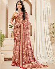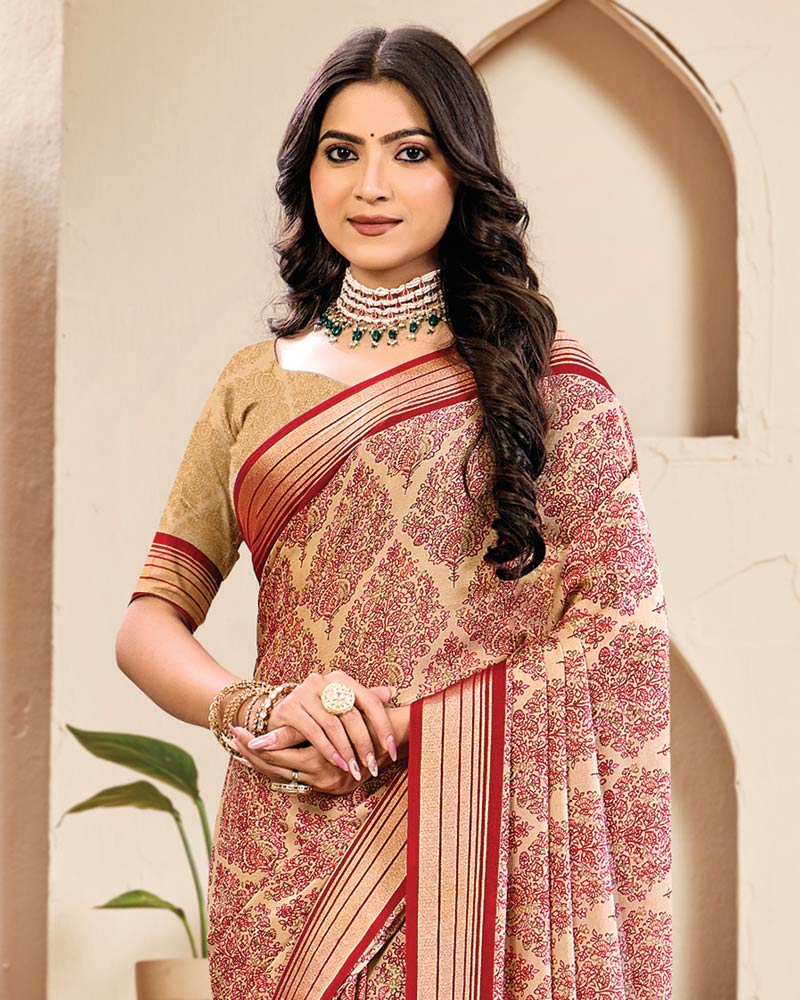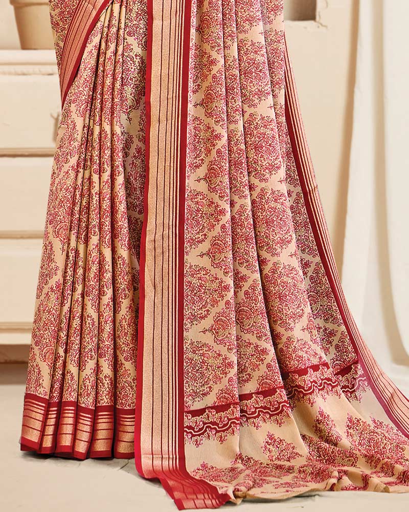 Vishal Prints Pastel Orange And Crimson Red Digital Print Criva Crepe Saree With Weaved Viscose Patta