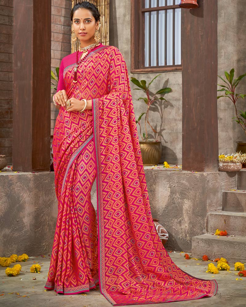 Vishal Prints Pastel Red Brasso Saree With Foil Print And Zari Border