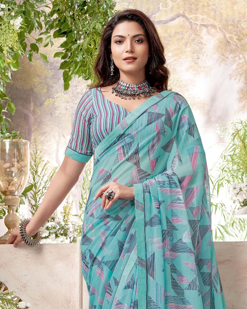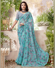Vishal Prints Pastel Teal Green Printed Georgette Saree With Fancy Border