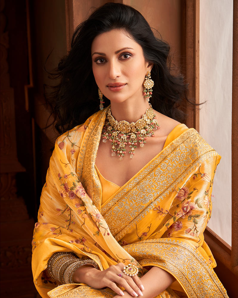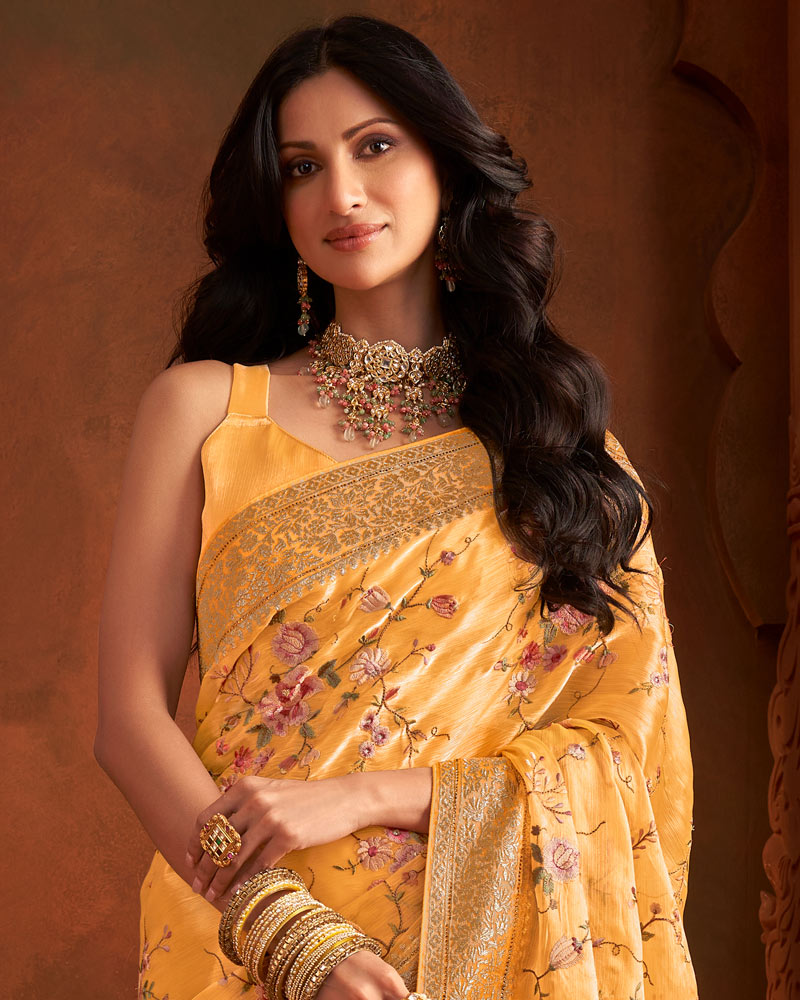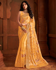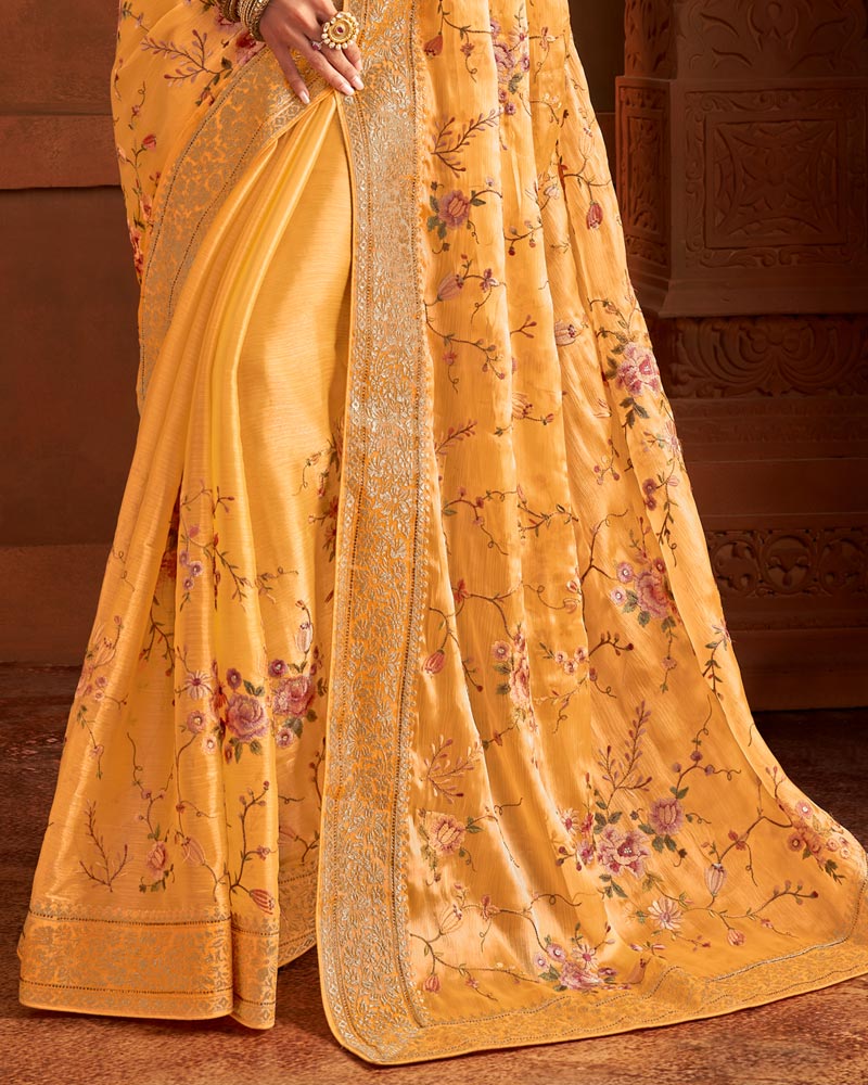 Vishal Prints Pastel Yellow Fancy Chiffon Saree With Embroidery-Jaal Work And Zari Embroidery Border