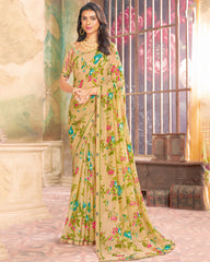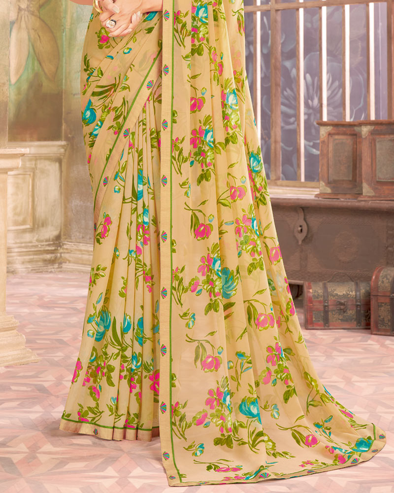 Vishal Prints Pastel Yellow Printed Georgette Saree With Fancy Border