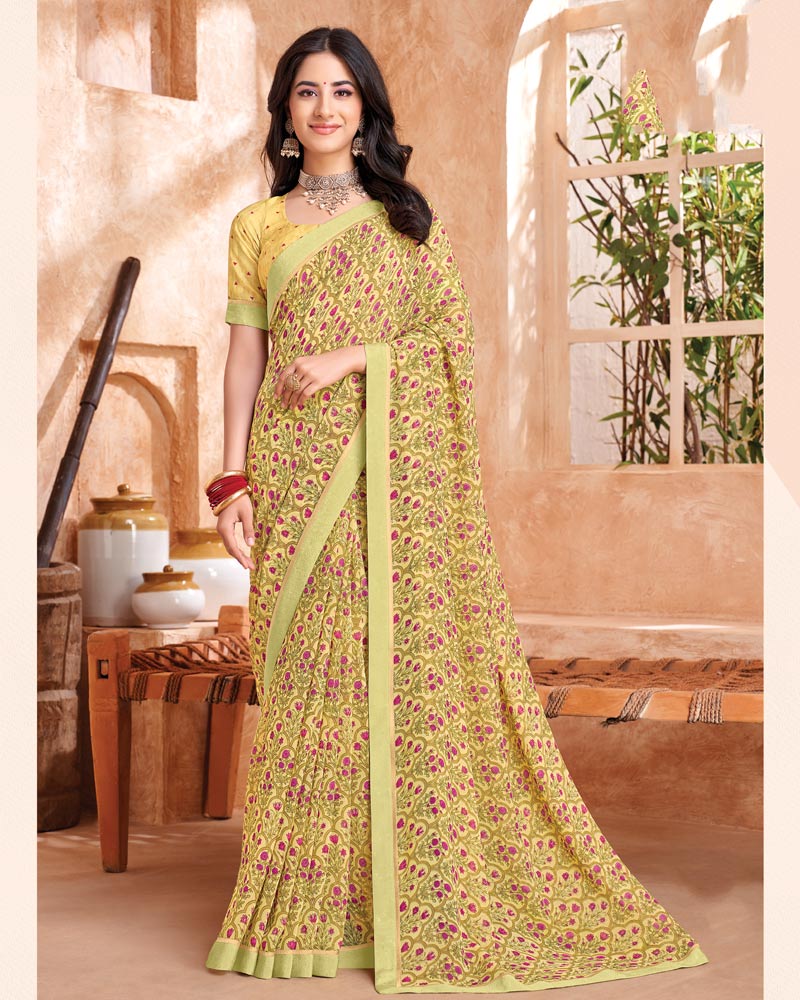 Vishal Prints Pastel Yellow Printed Georgette Saree With Fancy Border