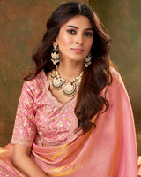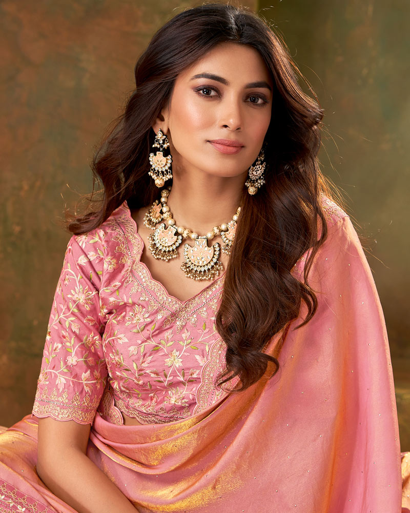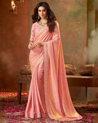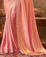 Vishal Prints Peach Fancy Satin Swarovski Work Saree With Embroidery Cut Work Border