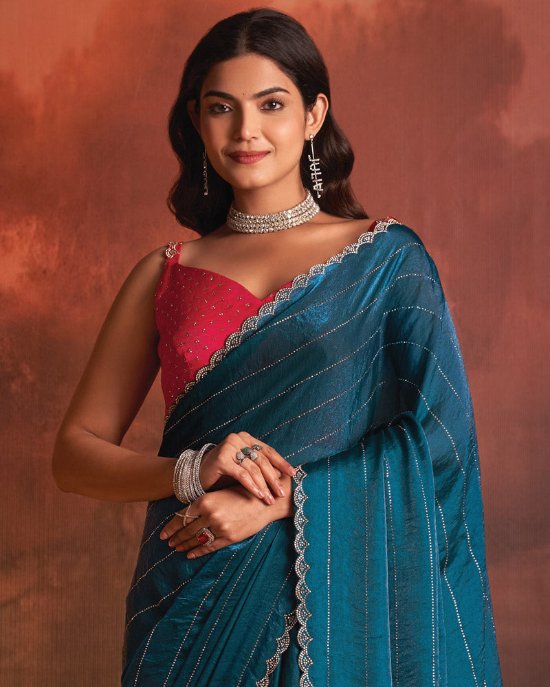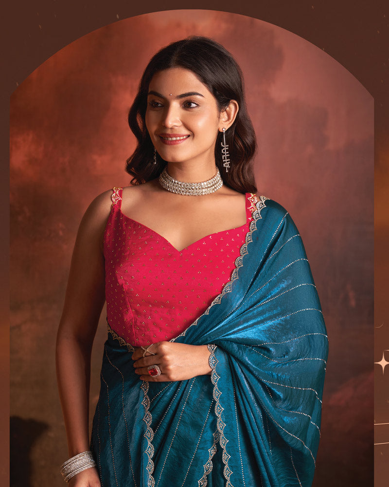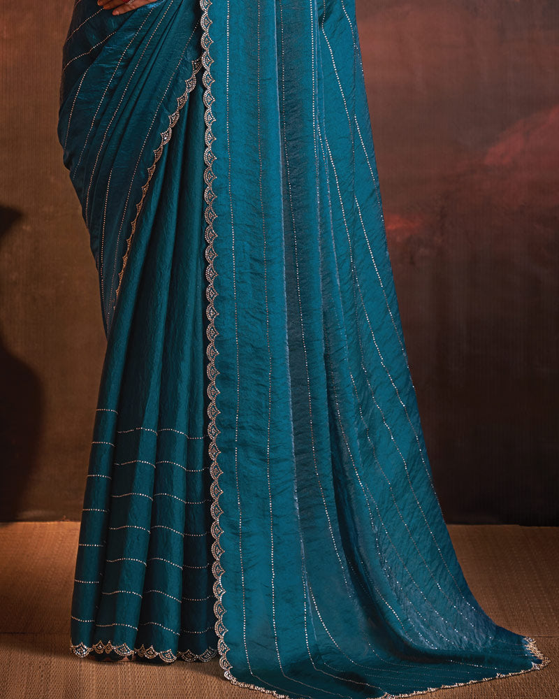 Vishal Prints Peacock Blue Designer Fancy Satin Saree With Diamond Work And Cut Work Border