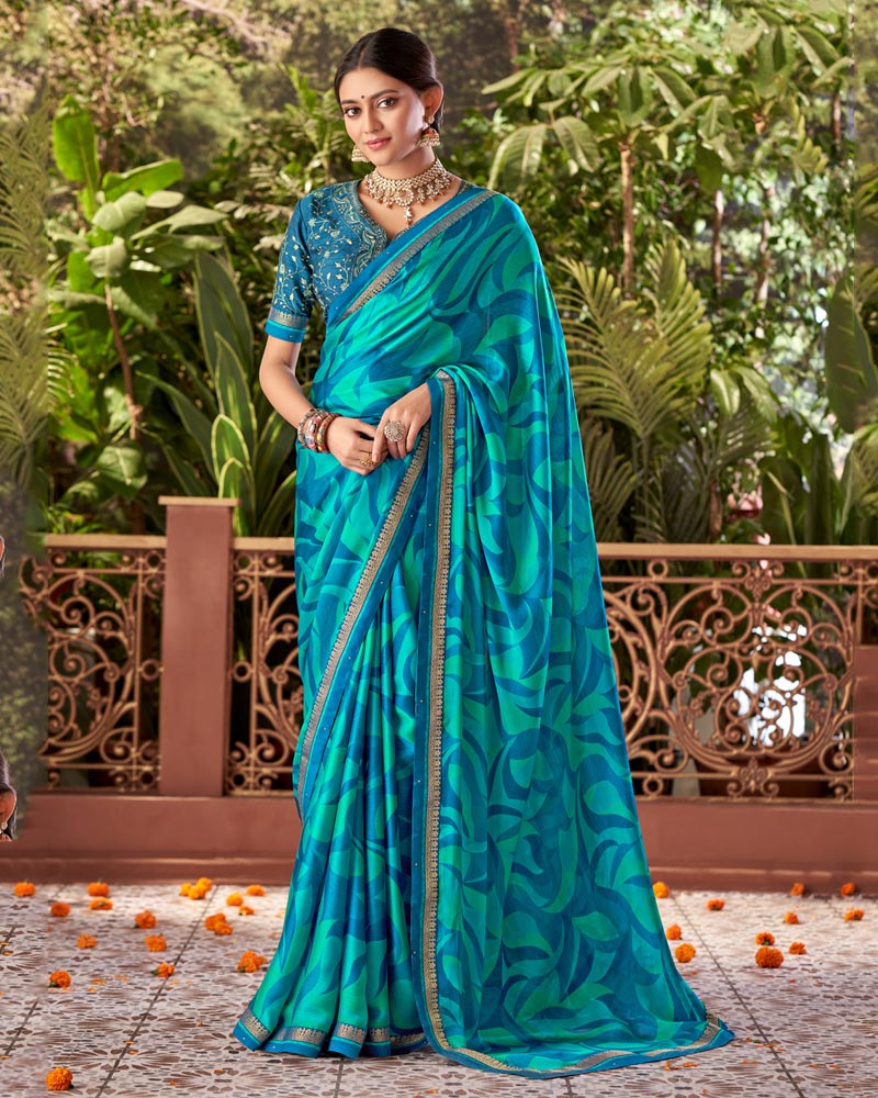Vishal Prints Peacock Blue Printed Fancy Chiffon Saree With Border
