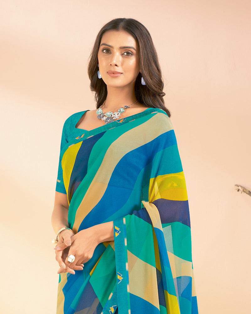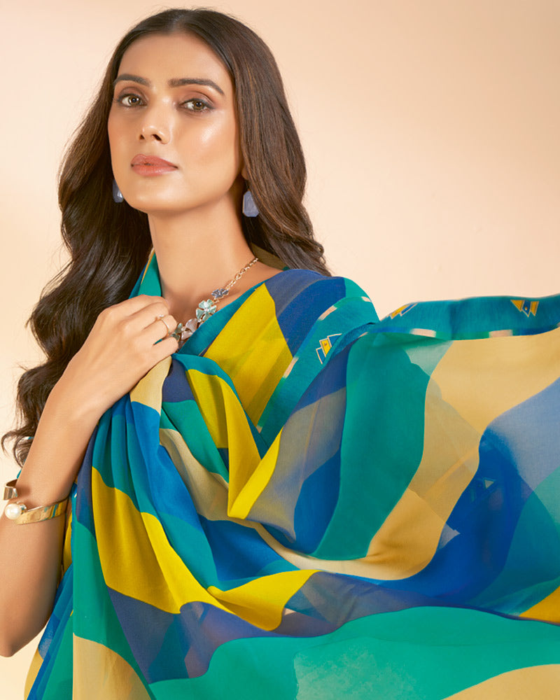 Vishal Prints Persian Green And Venice Blue Printed Georgette Saree With Fancy Border