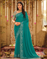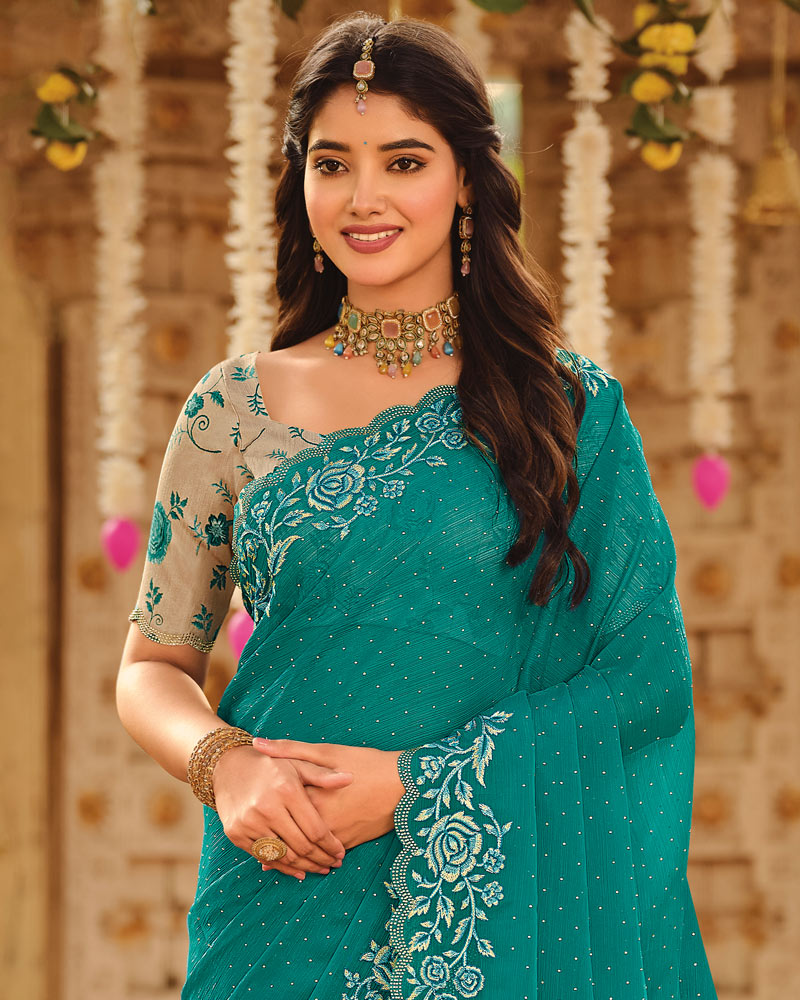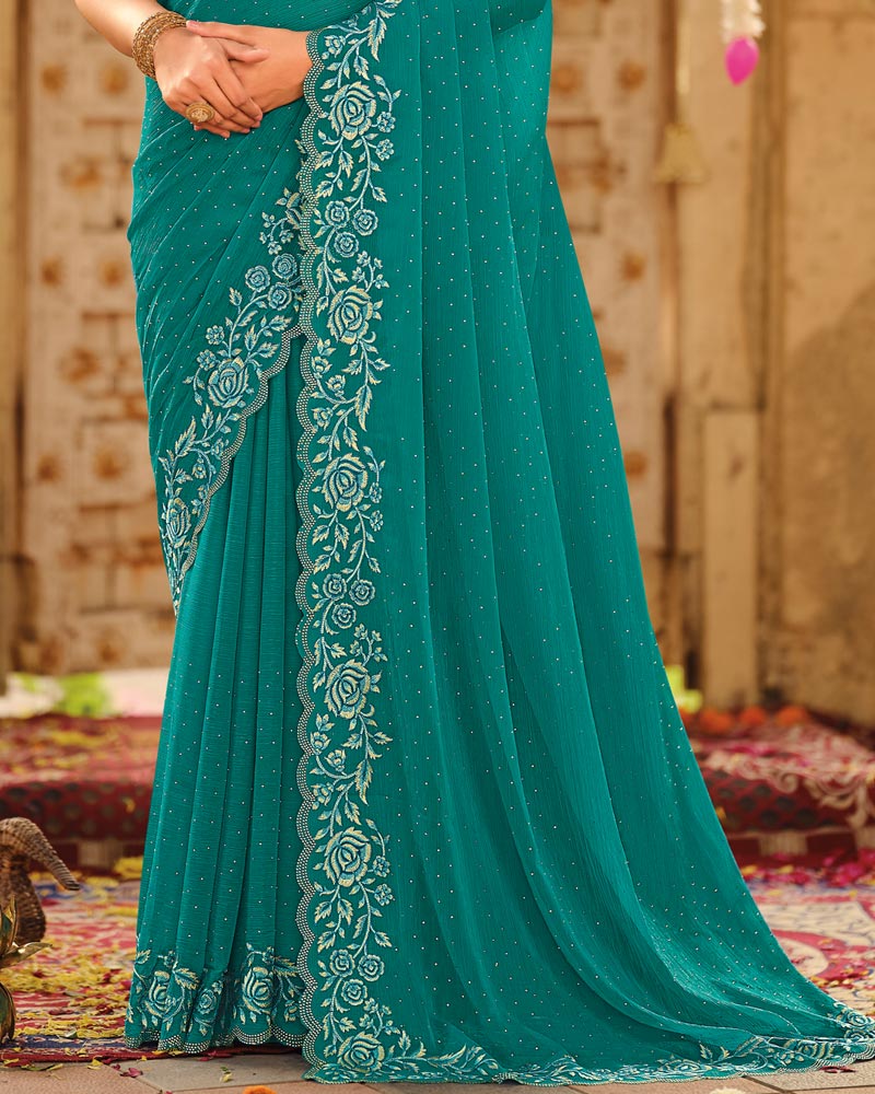Vishal Prints Persian Green Dyed Designer Chiffon Saree With Embroidery-Diamond Work And Cut Work Diamond Border