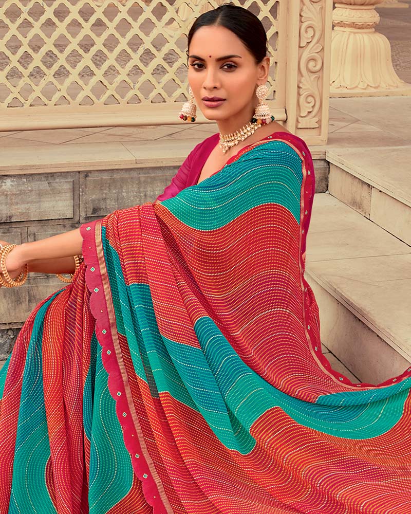 Vishal Prints Persian Red And Pine Green Printed Georgette Traditional Print Saree With Cut Work Border