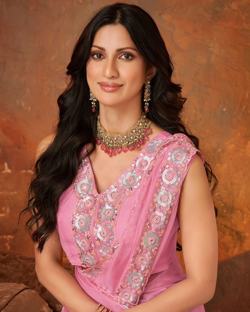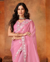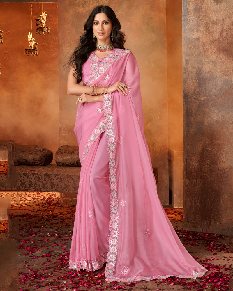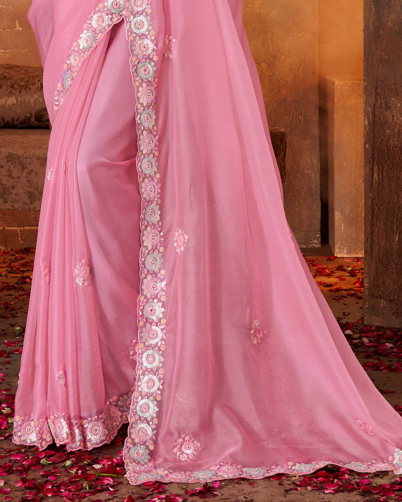 Vishal Prints Pink Chiffon Organza Saree With Sequence-Embroidery Butta And Cut Work Border