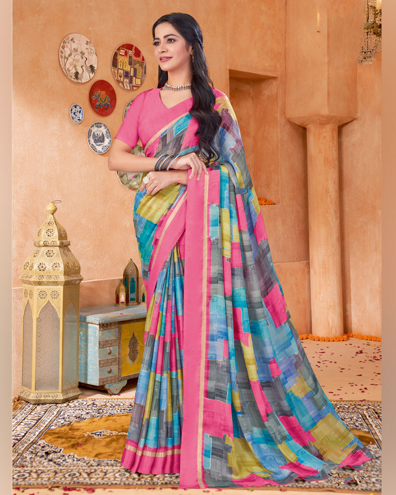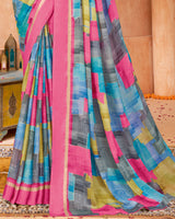 Vishal Prints Pink Digital Print Chiffon Saree With Foil Print And Weaved Satin Patta
