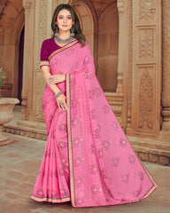 Vishal Prints Pink Printed Brasso Saree With Foil Print And Zari Border