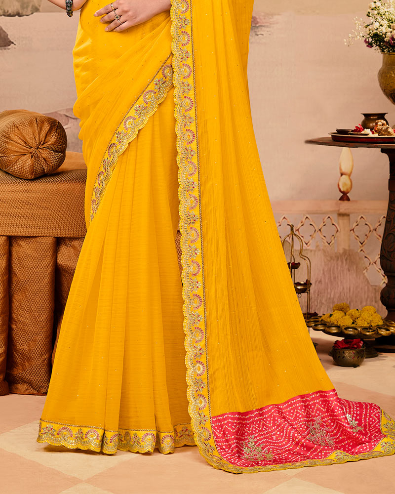 Vishal Prints Pinkish Red And Golden Yellow Designer Fancy Chiffon Traditional Print Saree With Weaved Satin Patta And Cut Work Embroidery Border