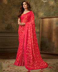 Vishal Prints Pinkish Red Designer Brasso Saree With Weaved Satin Patta And Diamond Work