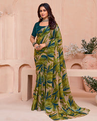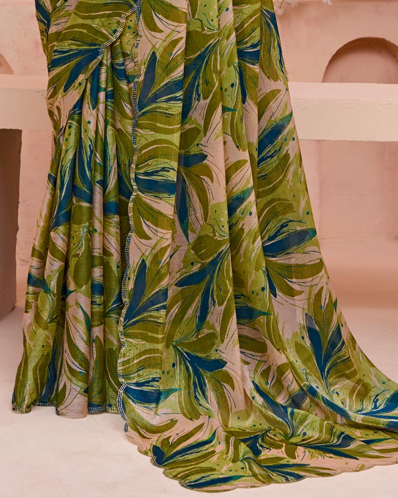 Vishal Prints Pinkish Tan And Brownish Green Digital Printed Satin-Chiffon Saree With Cut Work Diamond Border