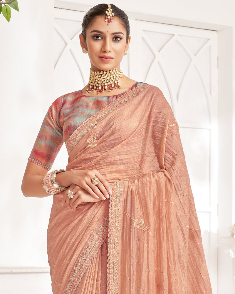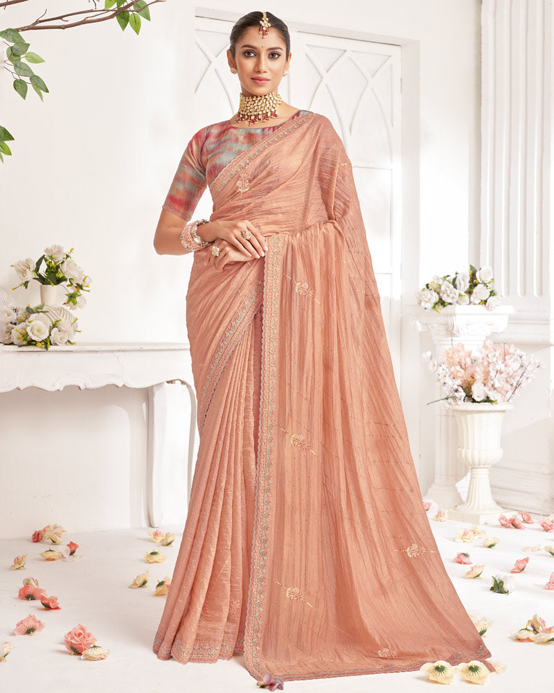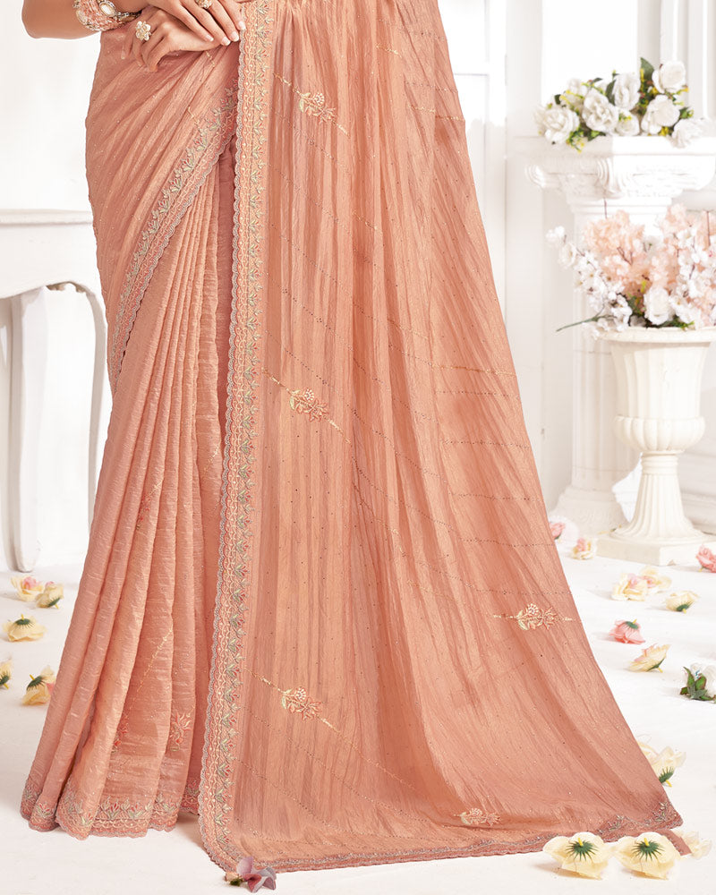 Vishal Prints Pinkish Tan Designer Crushed Organza Saree With Embroidery-Diamond Work And Cut Work Border