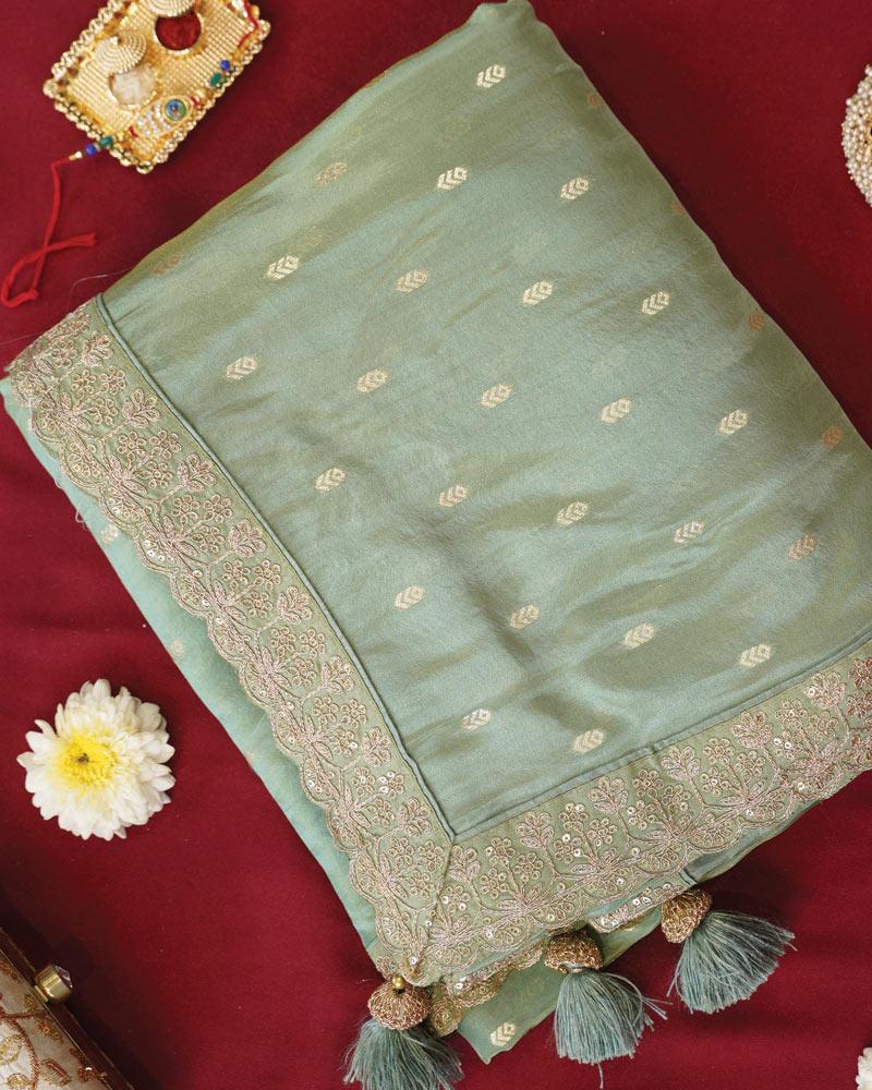 Vishal Prints Pista Green Designer Fancy Chiffon Saree With Viscose Weaving And Zari-Embroidery Border