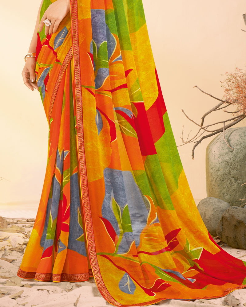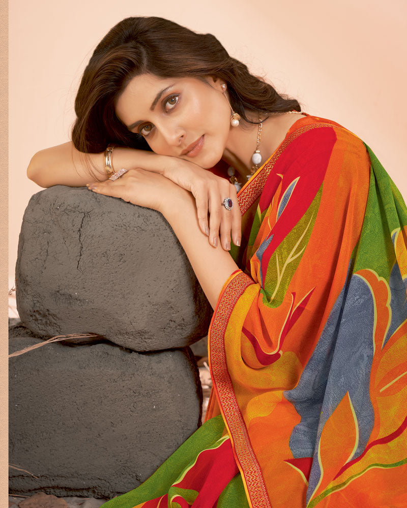 Vishal Prints Pumpkin Orange And Lava Red Printed Georgette Saree With Fancy Border