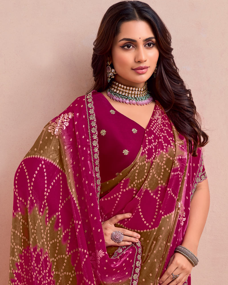 Vishal Prints Purple Red And Dull Brown Printed Fancy Satin Traditional Print Saree With Foil Print And Border