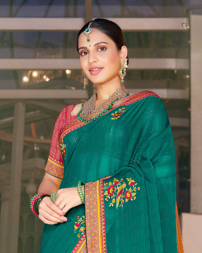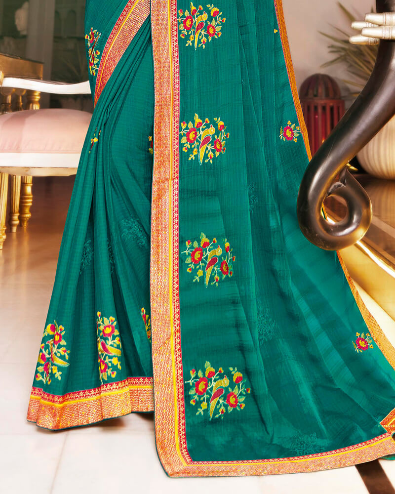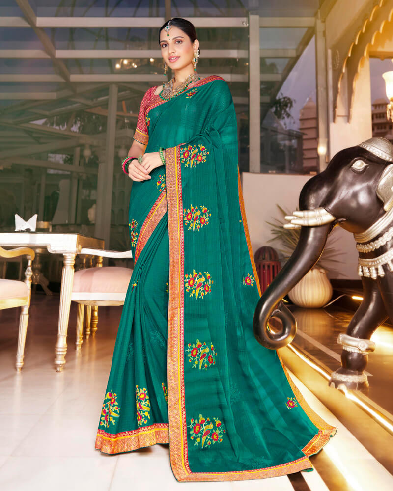 Vishal Prints Rama Green Chiffon Saree With Embroidery Work And Fancy Border
