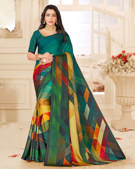 Vishal Prints Rama Green Digital Print Satin Saree With Stone Diamond Work And Core Piping