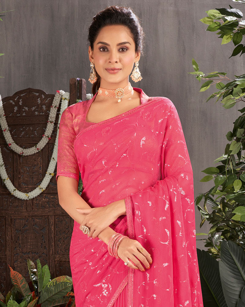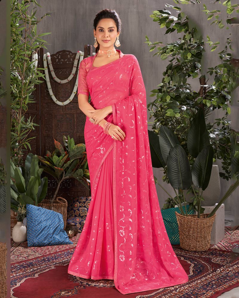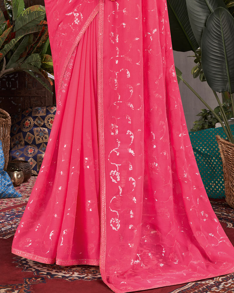 Vishal Prints Red Pink Designer Chiffon Saree With Embroidery And Diamond Work