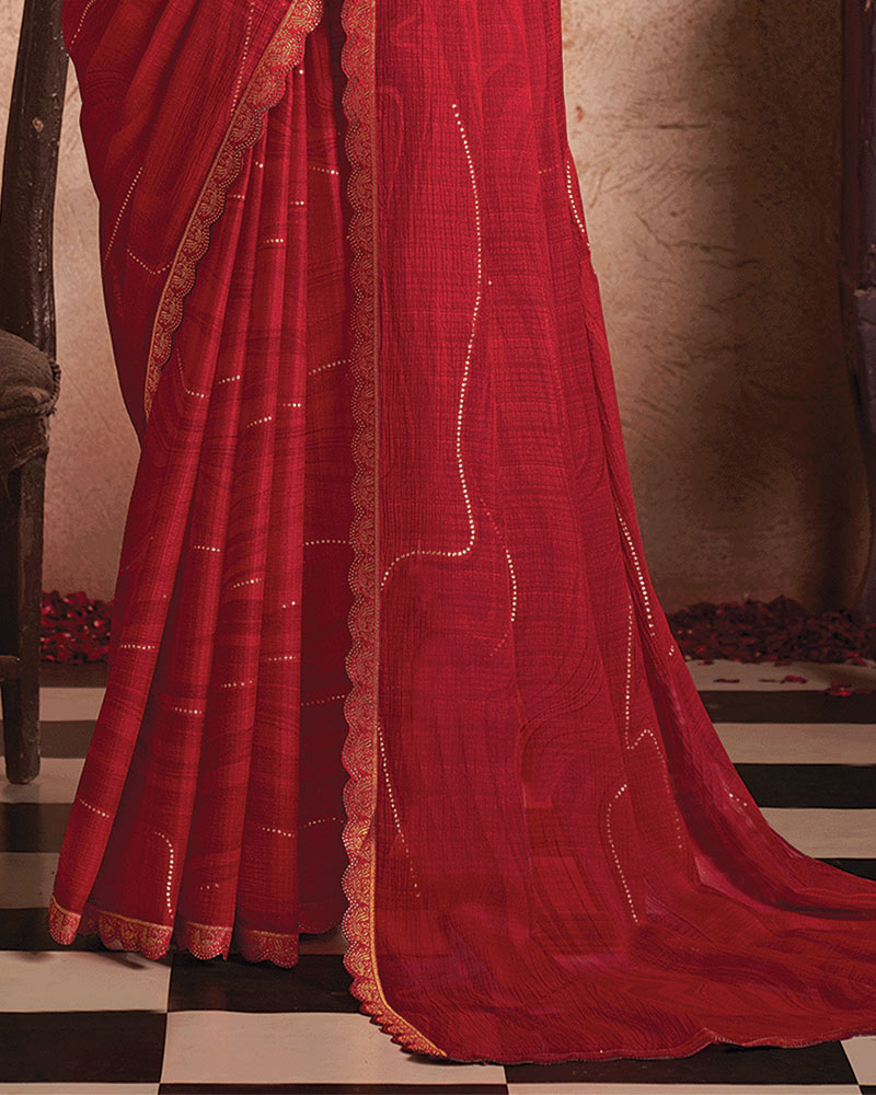 Vishal Prints Red Printed Luxury Chiffon Saree With Foil Print And Cut Work Embroidery Border