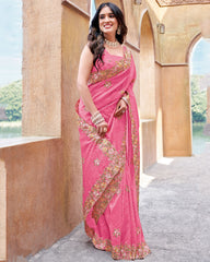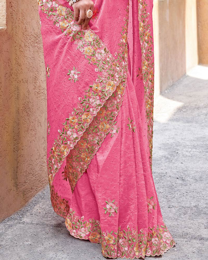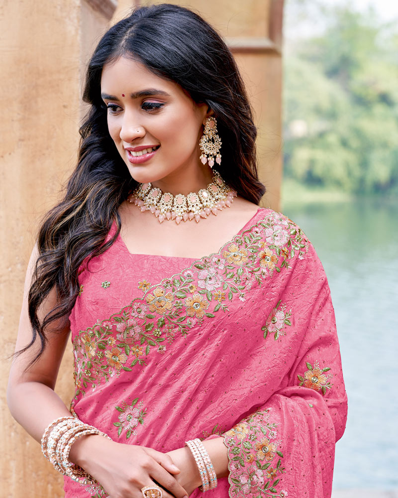 Vishal Prints Rosy Pink Designer Crushed Satin Saree With Embroidery-Diamond Work And Fancy Cut Work Border