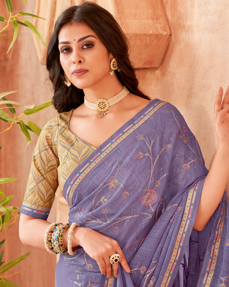 Vishal Prints Rum Violet Designer Patterned Chiffon Saree With Embroidery-Diamond Work And Fancy Border