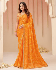 Vishal Prints Saffron Color Printed Chiffon Saree With Fancy Embroidery Work Border