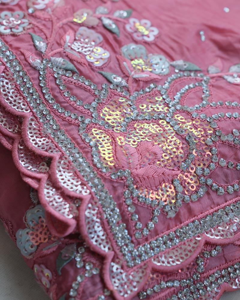 Vishal Prints Salmon Pink Tissue Organza Saree With Multi Sequence Embroidery-Diamond Work And Cut Work Border