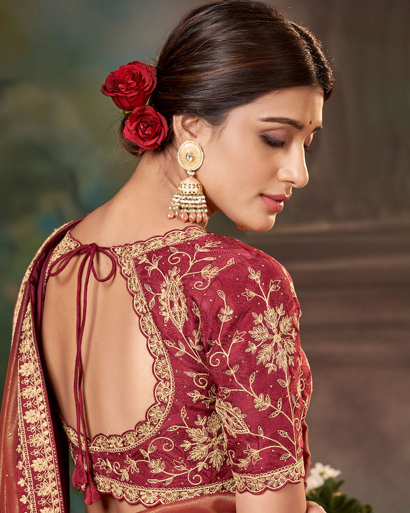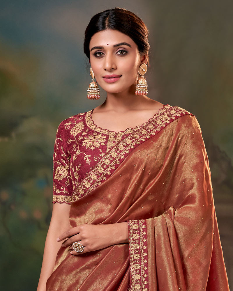 Vishal Prints Sepia Skin Orange Fancy Chiffon Saree With Diamond Work And Designer Zari Border