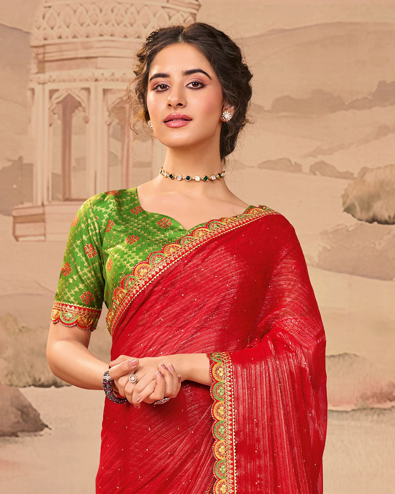 Vishal Prints Sindoori Red Designer Fancy Chiffon Saree With Diamond Work And Cut Work Embroidery Border