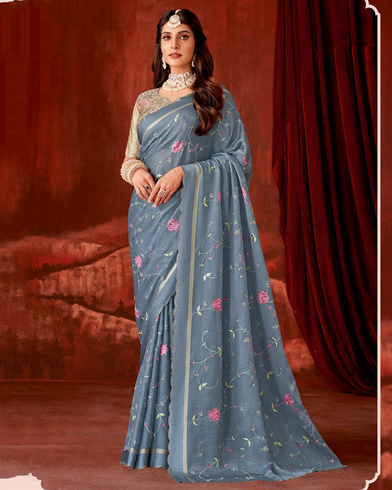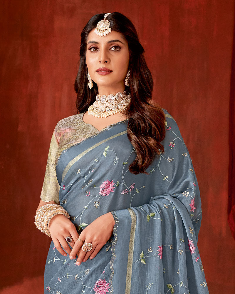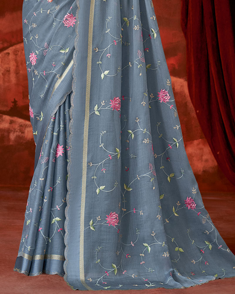 Vishal Prints Slate Grey Designer Chiffon Saree With Embroidery-Diamond Work And Satin Patta Cut Work Border