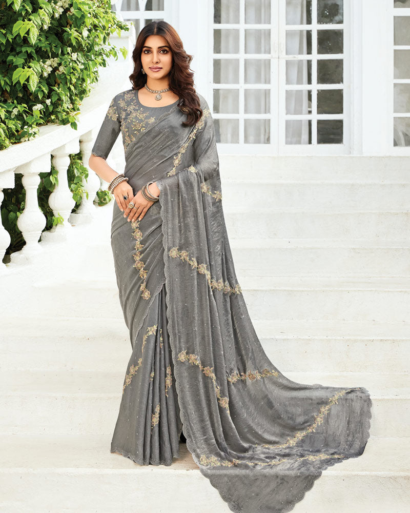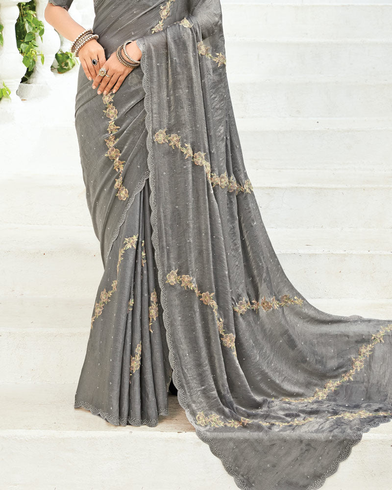 Vishal Prints Smokey Grey Designer Fancy Satin-Chiffon Saree With Embroidery-Diamond Work And Cut Work Border
