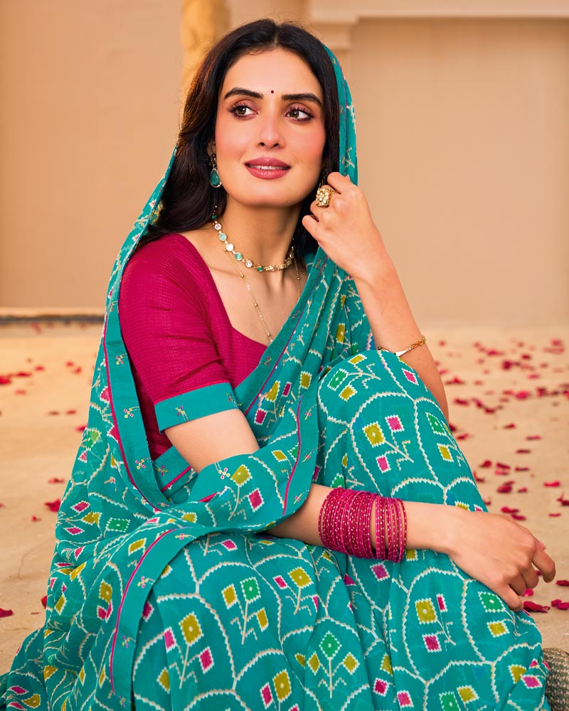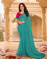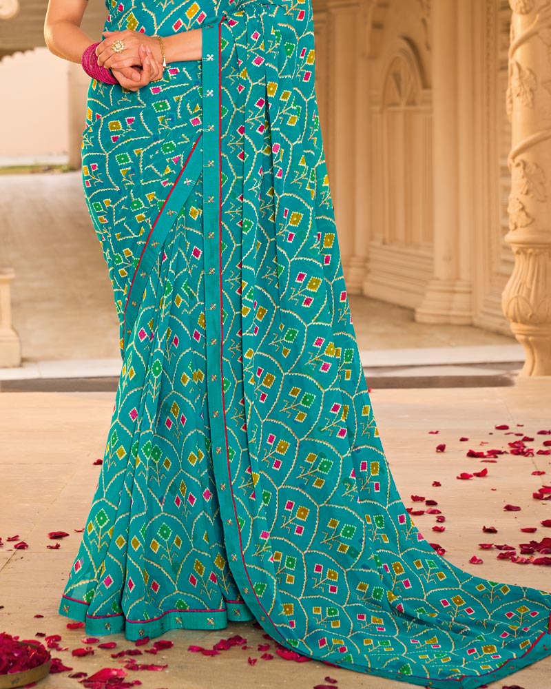Vishal Prints Teal Blue Printed Georgette Saree With Fancy Border