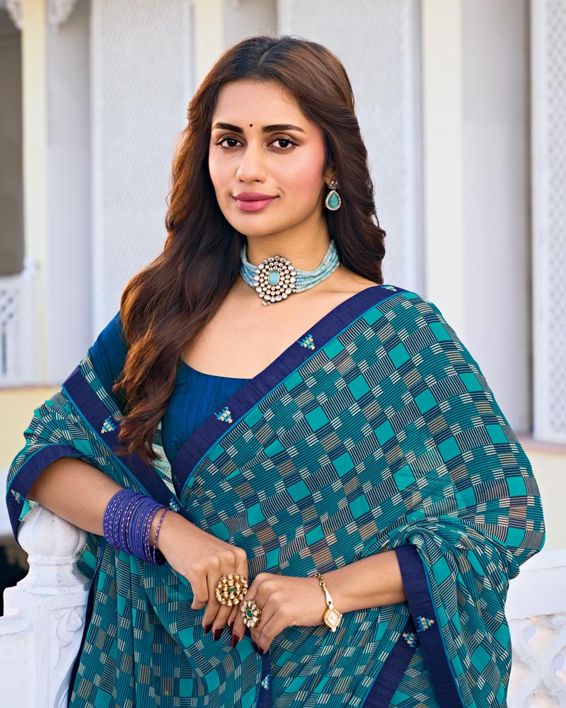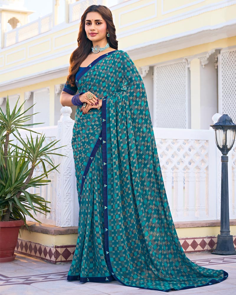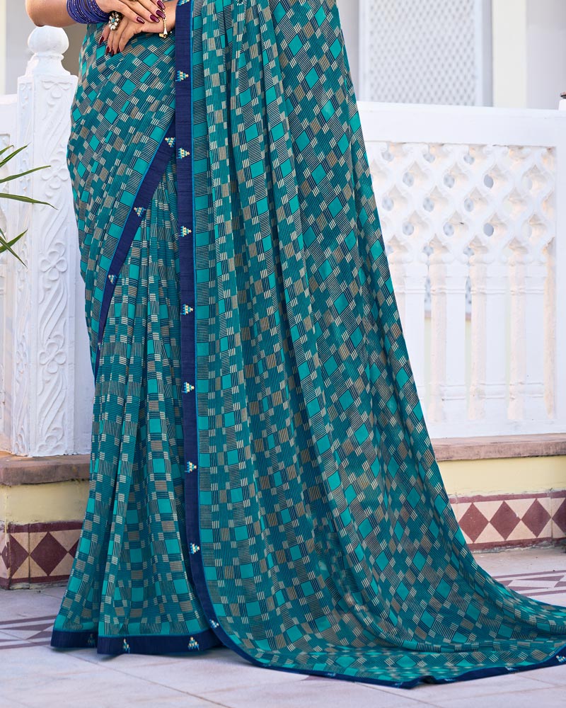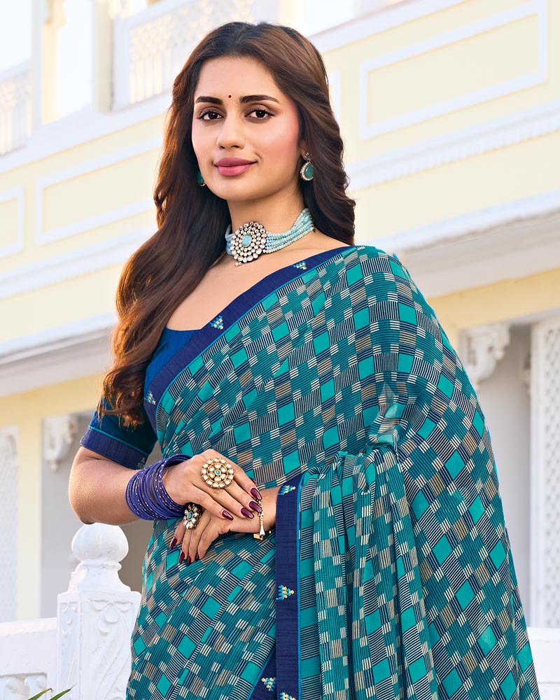 Vishal Prints Teal Blue Printed Georgette Saree With Fancy Border