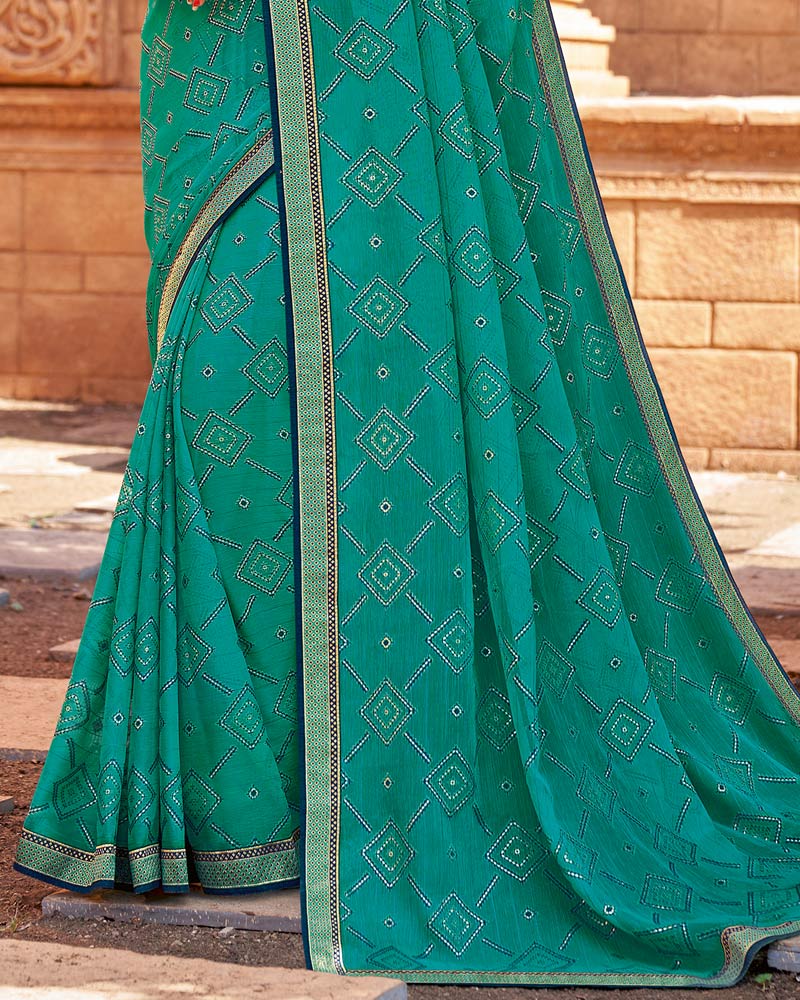 Vishal Prints Teal Chiffon Patterned Saree With Foil Print And Fancy Lace Border