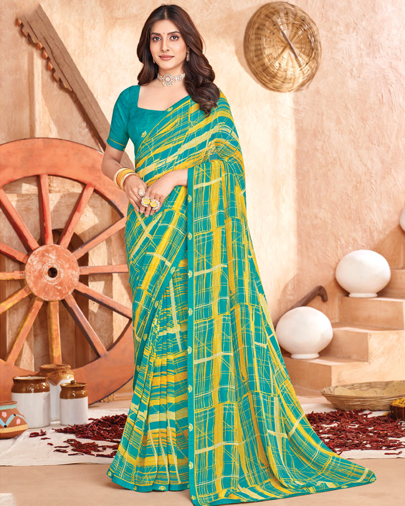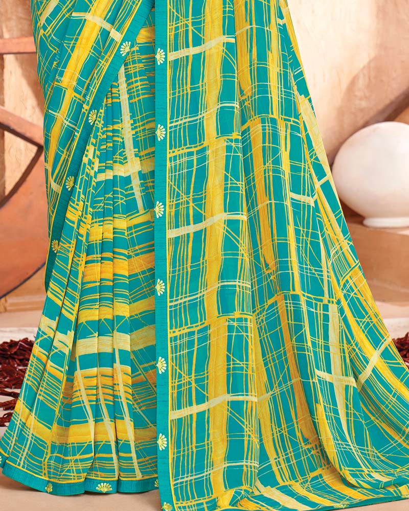 Vishal Prints Teal Green And Yellow Printed Georgette Saree With Fancy Border