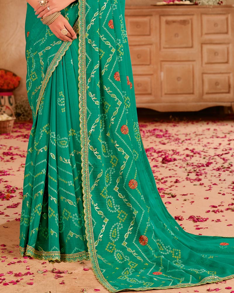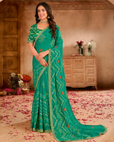 Vishal Prints Teal Green Printed Chiffon Saree With Foil Print And Cut Work Embroidery Border