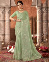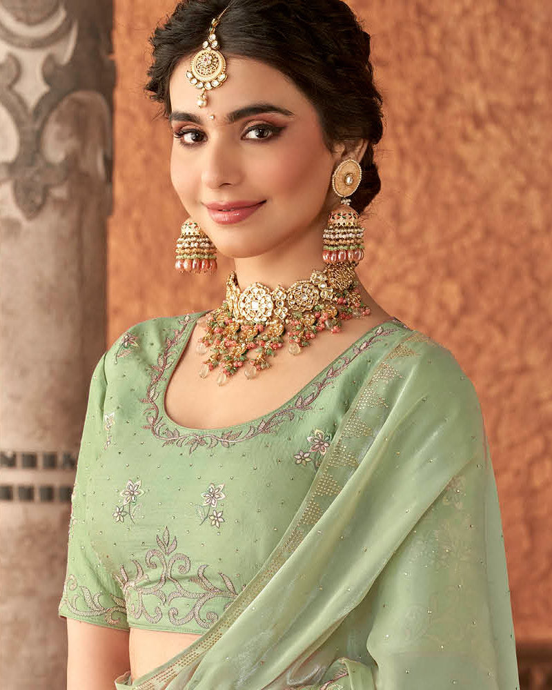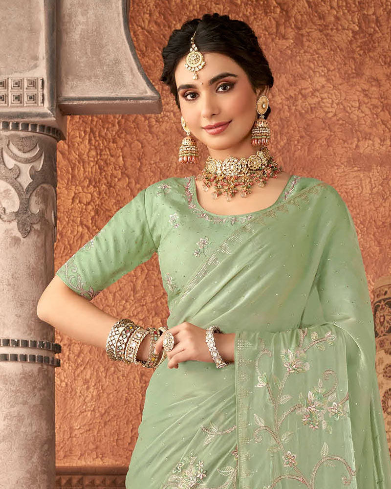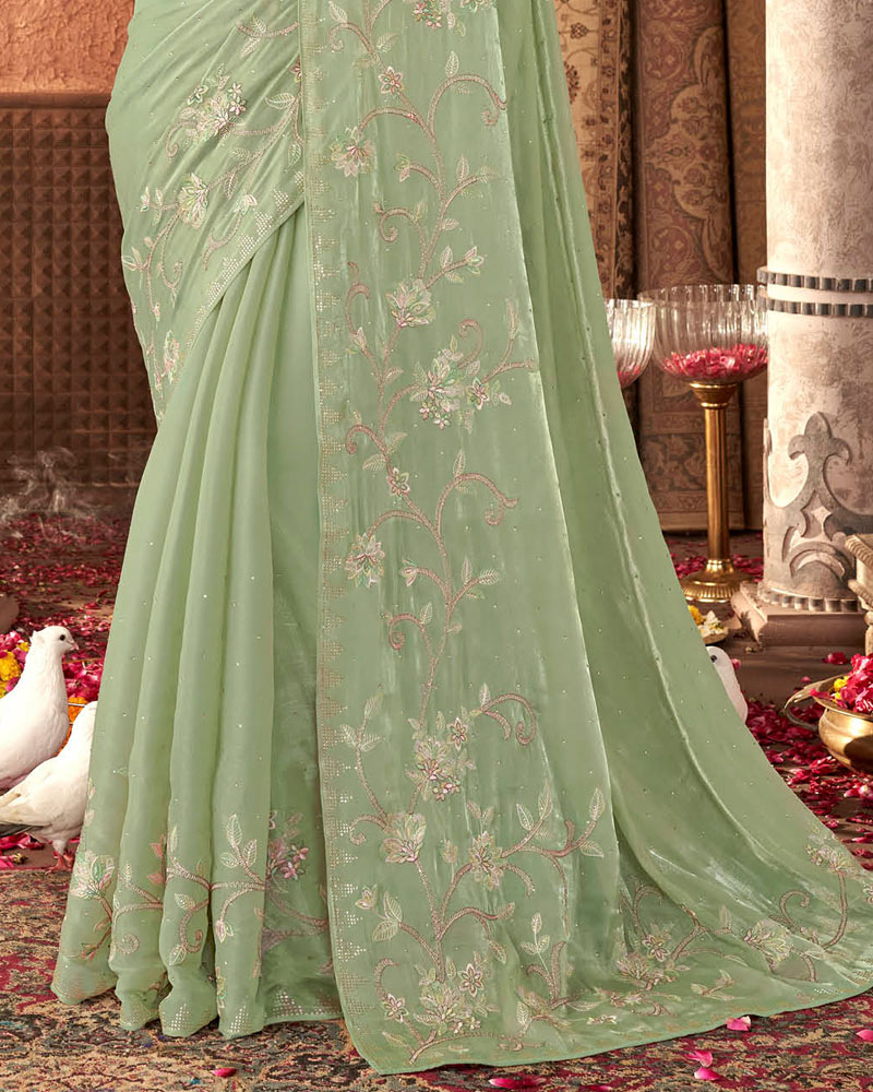 Vishal Prints Turquoise Green Designer Organza Saree With Embroidery Diamond Work And Core Piping
