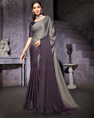 Vishal Prints Warm Grey And Charcoal Grey Satin Saree With Stone-Diamond Work