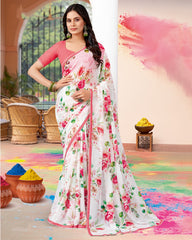 Vishal Prints White And Salmon Pink Printed Georgette Saree With Fancy Border