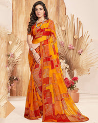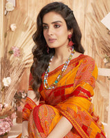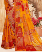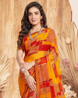 Vishal Prints Yellowish Orange Designer Chiffon Brasso Saree With Foil Print And Zari Border