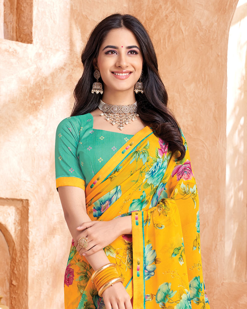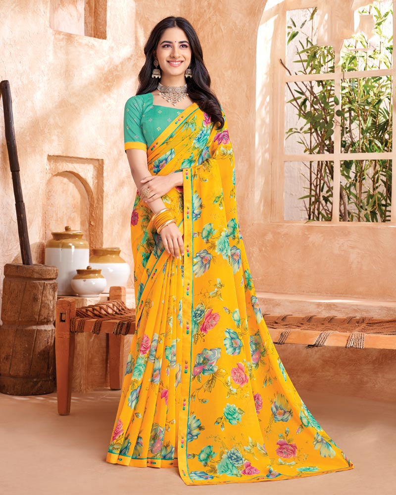 Vishal Prints Yellowish Orange Printed Georgette Saree With Fancy Border